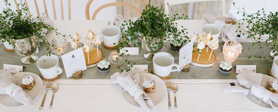 Eine Taufe liebevoll und modern dekorieren ist ganz einfach! Wir zeigen euch, dass Tauffeste alles andere als verstaubt sein müssen. Unsere Taufe im Skandi Boot Look beweist, dass Tauffeiern zu stilvollen modernen Familienfesten werden können. Stoffservietten aus Leinen in einem zarten Grau auf weißen Geschirr und der Samttischläufer in Salbei - genau so stelle ich mir skandinavisch puristische Festtafeln für kleine Jungs oder Mädchen vor. Teelichter in unterschiedlichen Teelichtgläsern zaubern schöne Lichtreflexe auf den Tisch und zaubern eine heimelige Atmosphäre. Für mehr Inspiration zum Thema Taufe schaut doch einfach auf dem Blog vorbei.