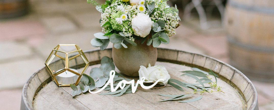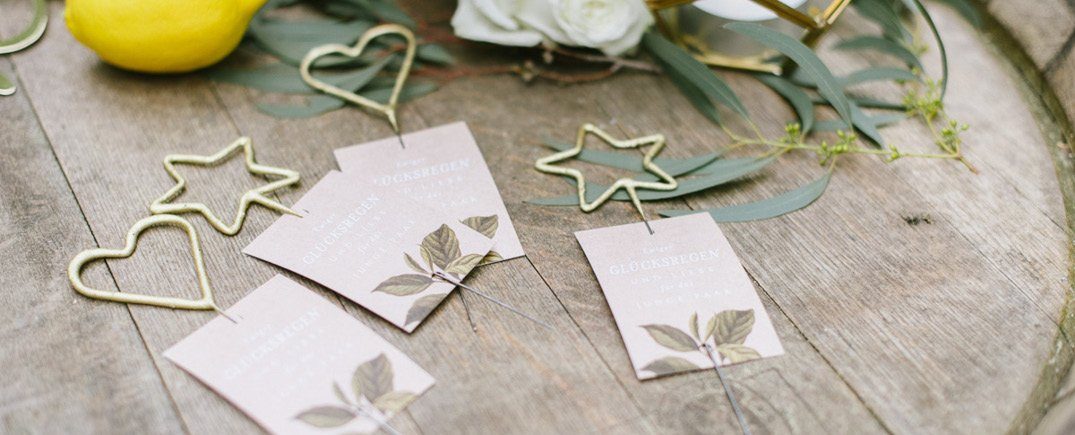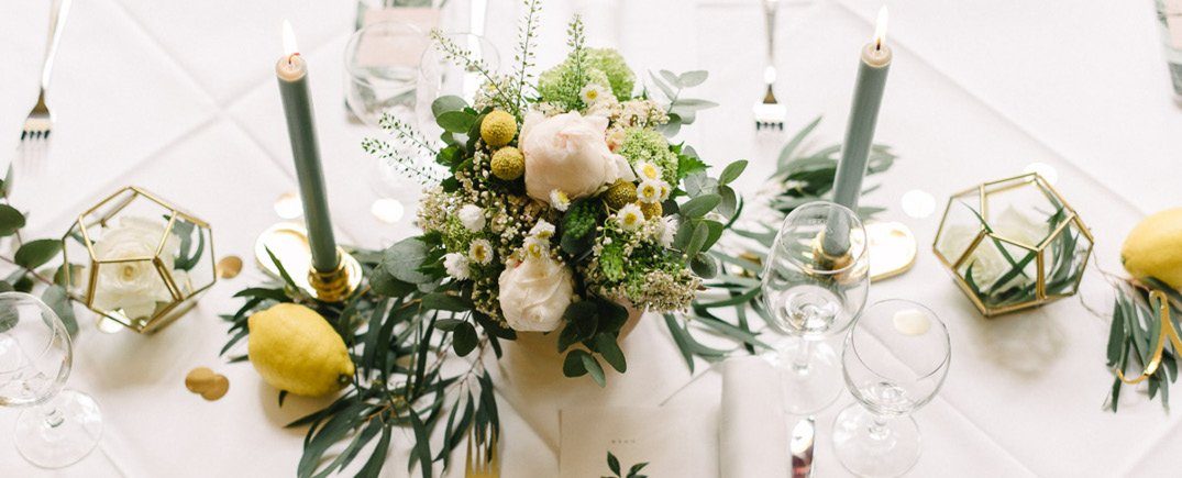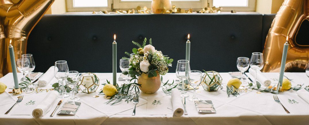 Frisch, sommerlich, elegant und doch modern: diese Tischdekoration in Gold, Gelb und Salbei macht gute Laune bei der Hochzeit. Hohe Kerzen in einem sanften Salbeiton sorgen für eine gemütliche Lichtstimmung und greifen die Farben der Floristik auf. Die lockeren Wiesenblumen werden mit frischem Eukalyptus und goldenem Konfetti auf dem Tisch kombiniert. Moderner Akzent: die Glasterrarien mit Messingstäben, die einzelne Blüten beinhalten. Goldene Love-Schriftzüge und frische Zitronen runden die Dekoration ab.