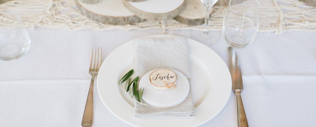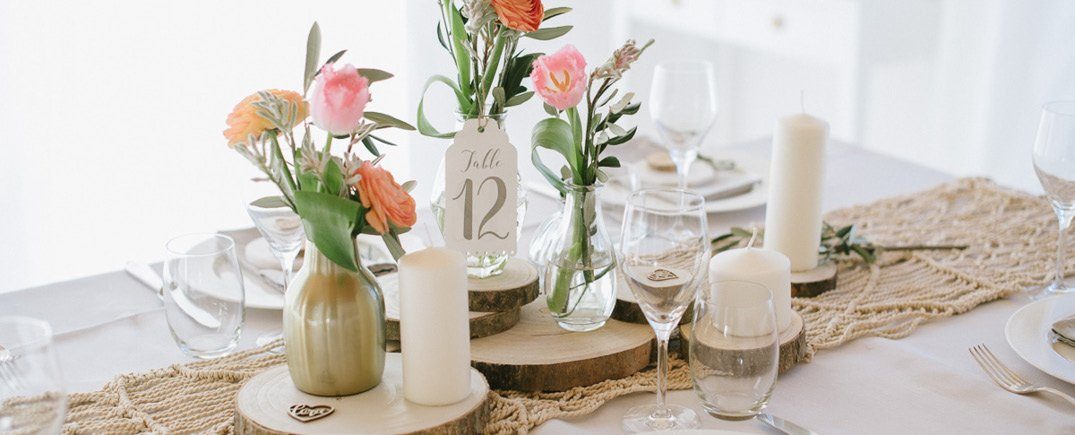 Natürlichkeit und Bohoelemente passen hervorragend zusammen bei der Hochzeitsdekoration. Der lässige Look von Baumscheiben, Blumen in kleinen Vasen und Leinenservietten wird durch Elemente im Boho Stil ergänzt. Macrames, die Dekorationselemente mit kunstvoll arrangierten und geknüpften, dürfen auf keinen Fall fehlen. Hier und da ein Pünktchen Roségold rundet das Arrangement ab. Tipps zum Dekorieren mit Baumscheiben findet Ihr auf dem Blog!