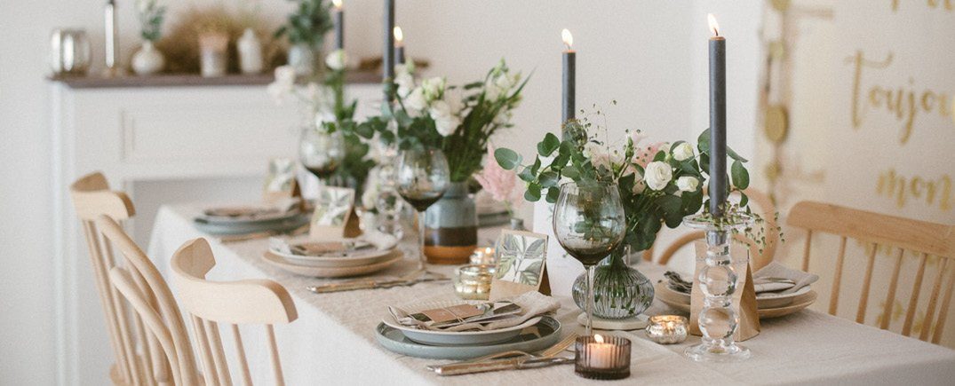 Natürlichkeit trifft auf lässige Entspanntheit bei dieser Hochzeitsdekoration. Leinen, Holz und romantische Blumen bilden eine relaxte Atmosphäre. Auf den Tischen liegen Leinentischdecken oder Leinentischläufer. Viele unterschiedliche Vasen und Gläser beinhalten locker gesteckte Blumen. Lange, schiefergraue Stabkerzen sorgen für einen eleganten Touch. Die Farbpalette erstreckt sich von einem kernigen Creme über ein warmes Graublau bis hin zu einem natürlichen Olive.