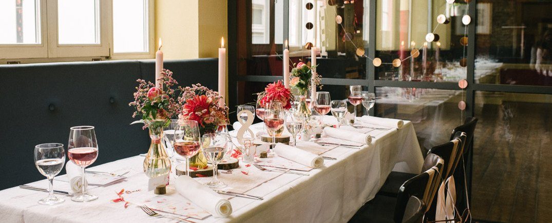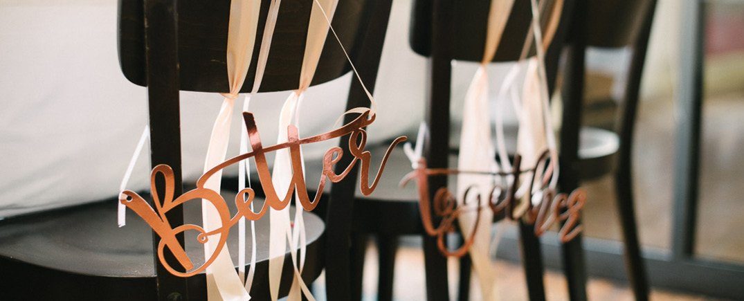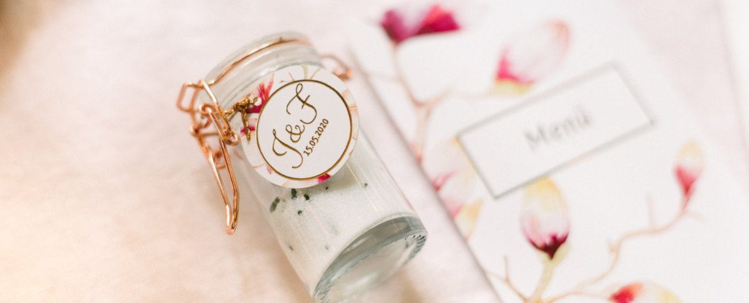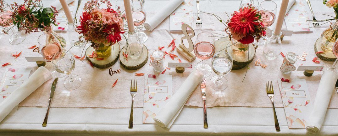 Elemente aus natürlichen Materialien werden auch 2019 eine große Rolle spielen. Während sich der typische Vintage Trend mit Vogelkäfig & Co so langsam verdünnisiert, werden einige Kernelemente in neue Stilrichtungen überführt. Baumscheiben und Blumensträuße in kleinen Vasen bleiben, statt Pastelltönen punkten nun aber kräftige Farben in den Vasen. Spitzenbänder werden durch glatte Satinbänder ersetzt und metallische Akzente in Roségold bieten einen interessanten Kontrast. Der Stil Eurer Hochzeit darf sich gerne durch weitere Tagespunkte ziehen, denn nur so entsteht ein einheitlicher Look und ein stimmiges Ganzes. Wie wäre es mit roségoldenem Konfetti nach der Trauung? Oder Papiertrinkhalme in Roségold beim Sektempfang an der Location. Diese Kleinigkeiten machen Euren Tag persönlich und individuell!