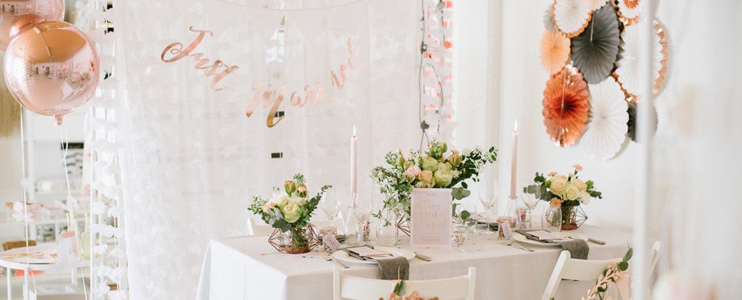 Roségold ist der neue Star der Farbpalette! Der warme, metallisch glänzende Ton verleiht jedem Fest eine gewisse Eleganz und ist damit zur Trendfarbe geworden. In Kombination mit Créme, Salbeigrün und Altrosé wirkt es sehr romantisch. Ein kräftiges Dunkel- oder Graublau harmoniert ebenso gut wie verschiedene Grautöne mit Roségold.