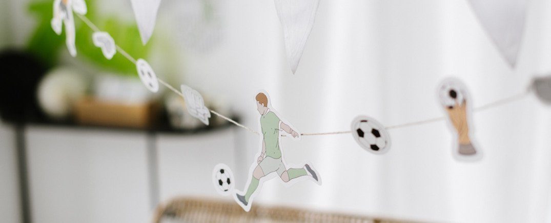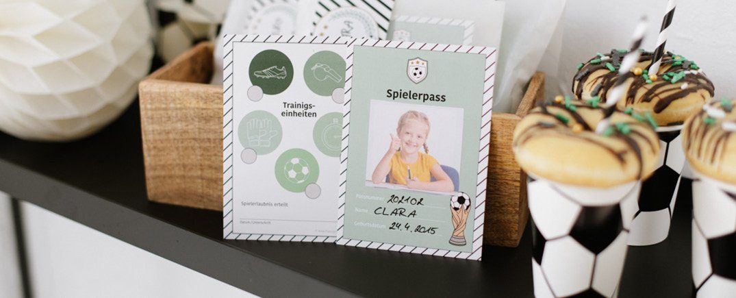 Den Raum dekoriert Ihr mit einer Fußballgirlande und passenden Wimpeln zum Aufhängen. Mit dem Spielerpass erhalten die Kinder ihre Spielerlaubnis und lösen verschiedene Aufgaben oder Spiele. In diesem Blogpost findet Ihr zudem ein Fußballquiz, das Ihr gratis herunterladen könnt! Viel Spaß bei der Fußballparty!