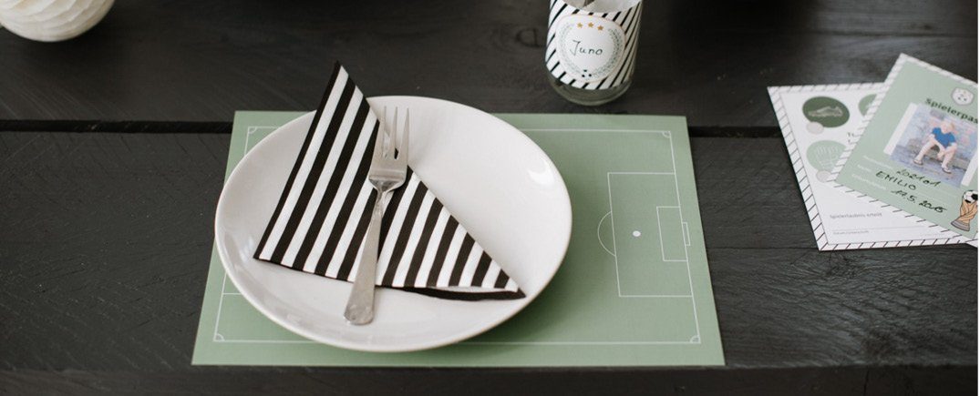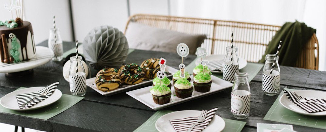 Feiert eine moderne Fußballparty zum Kindergeburtstag! Die Fußballpartybox enthält alles, um einen unverwechselbaren Kindergeburtstag zu feiern. Coole Einladungen mit Fußballmotiven und Lückentexten zum einfachen Ausfüllen und Verteilen. Der Tisch wird mit Platzsets in Form eines Fußballfeldes für jeden Gast, Banderolen zum Beschriften für die Trinkflaschen, passenden Servietten und Trinkhalmen geschmückt. Auf dem Kuchen oder den Cupcakes befinden sich Cake Topper mit Fußballmotiven wie Ball, Schuhe, Pokal und Spieler.
