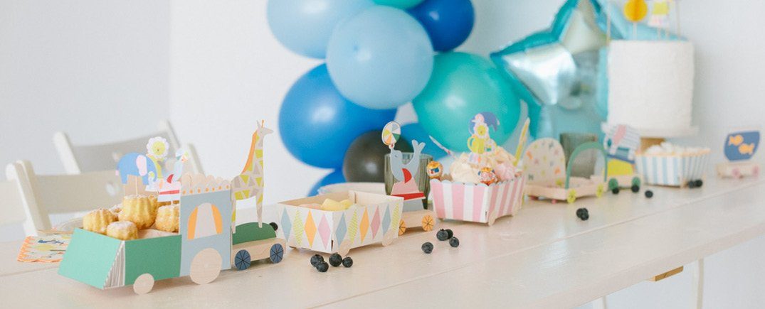 Die bunte Welt des Zirkus ist ein tolles Motto für einen Kindergeburtstag. Die Serie Silly Circus macht kleinen und großen Geburtstagskindern Spaß. Der Zug aus Zirkuswagen ist Dekorationselement und Heimat für Snacks und Süßigkeiten gleichermaßen. Seine Wagen lassen sich mit Naschereien füllen. Passende Servietten und Teller findet Ihr in unserem Sortiment. Überraschend und beeindruckend: Die Ballongirlande in Blau, Weiß, Petrol und Grau.