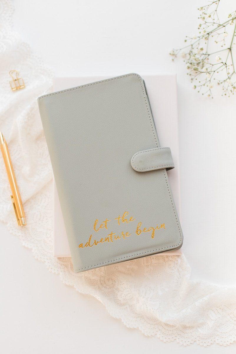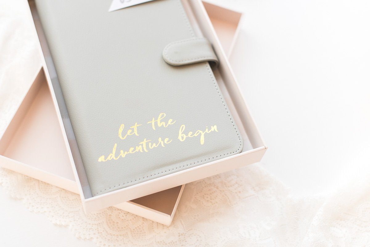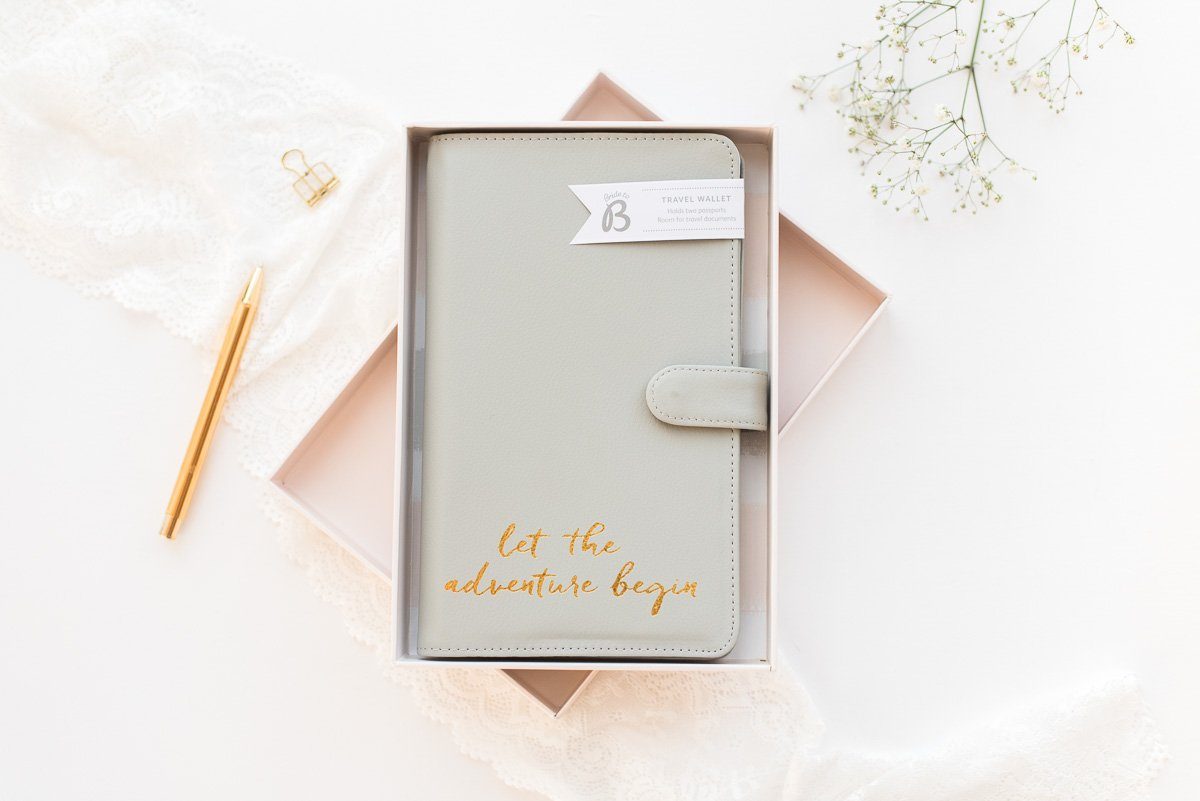 Um die Pässe, Reiseunterlagen und Urlaubserinnerungen während der Reise gut aufzuheben, findet ihr im Fräulein K Shop ein elegantes Reiseneccesaire in Grau. Mit dem goldenen Schriftzug ‚Let the adventure begin‘ startet das Brautpaar perfekt organisiert in die romantischste Reise ihres Lebens.