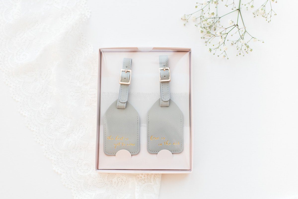 Und passend zum Reiseetui: Mit den beiden grauen Kofferanhängern mit goldenen Aufdrucken ‚best is yet to come‘ und ‚love is in the air‘ können die Koffer der Frisch-Vermählten in den Flitterwochen nie verloren gehen. Was für ein schönes Hochzeitsgeschenk!