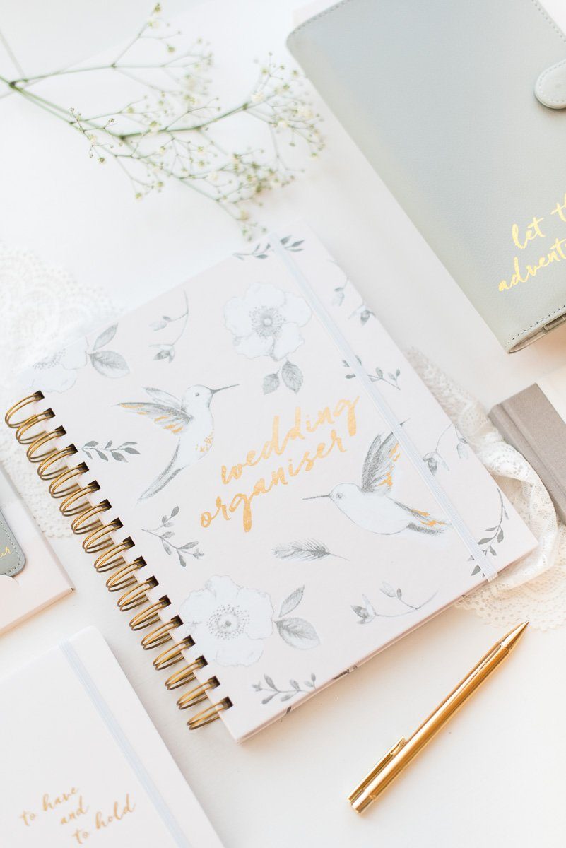 Mit diesem ultimativen Helfer für die perfekte Hochzeit behaltet ihr den Überblick und habt zudem viele Möglichkeiten Ideen und Notizen festzuhalten. Und im eleganten Design mit der goldenen Aufschrift ‚Wedding Organizer‘ und feinen Blüte und Kolibris findet der Organizer auch nach der Hochzeit einen schönen Platz im Bücherregal oder der Erinnerungskiste.
