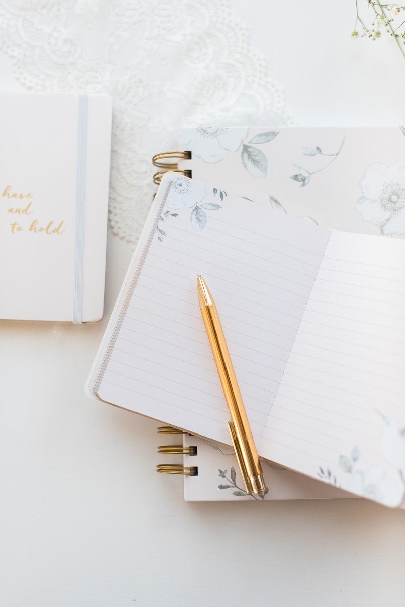 Aber auch schon vor der Hochzeit kann die Bride to be hier all ihre Gedanken und Ideen festhalten. So wird das Notizbuch zum ständigen Begleiter in der Handtasche der Braut. Die Innenseiten sind teils liniert, teils mit floralem Muster verziert oder auch unbedruckt.
