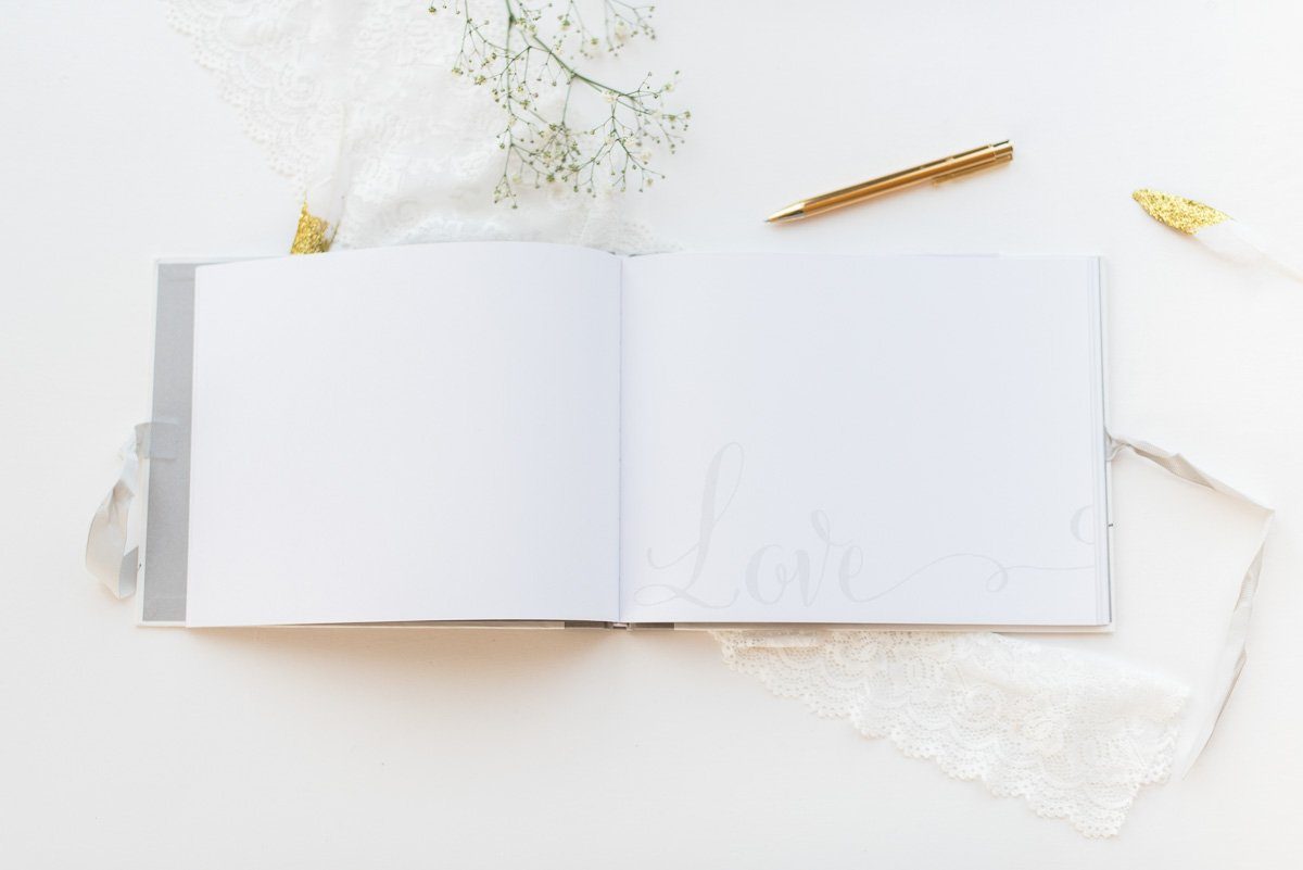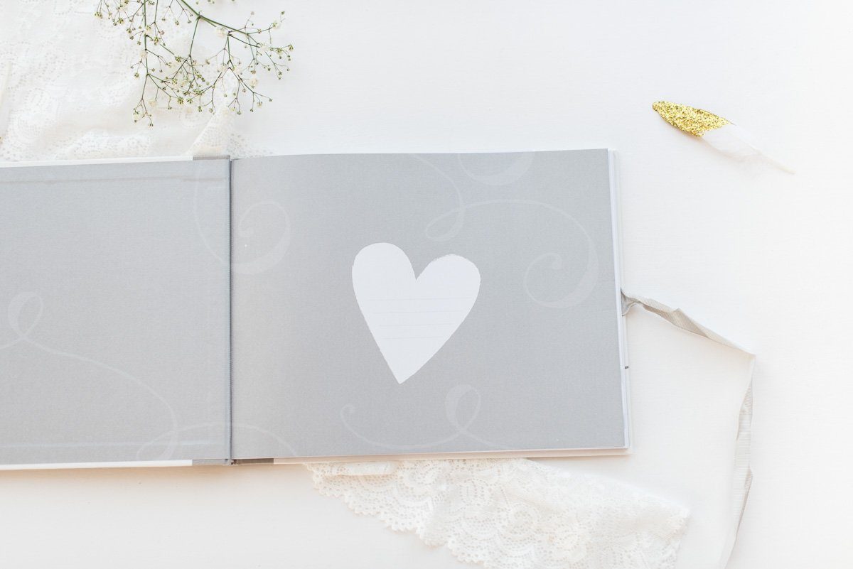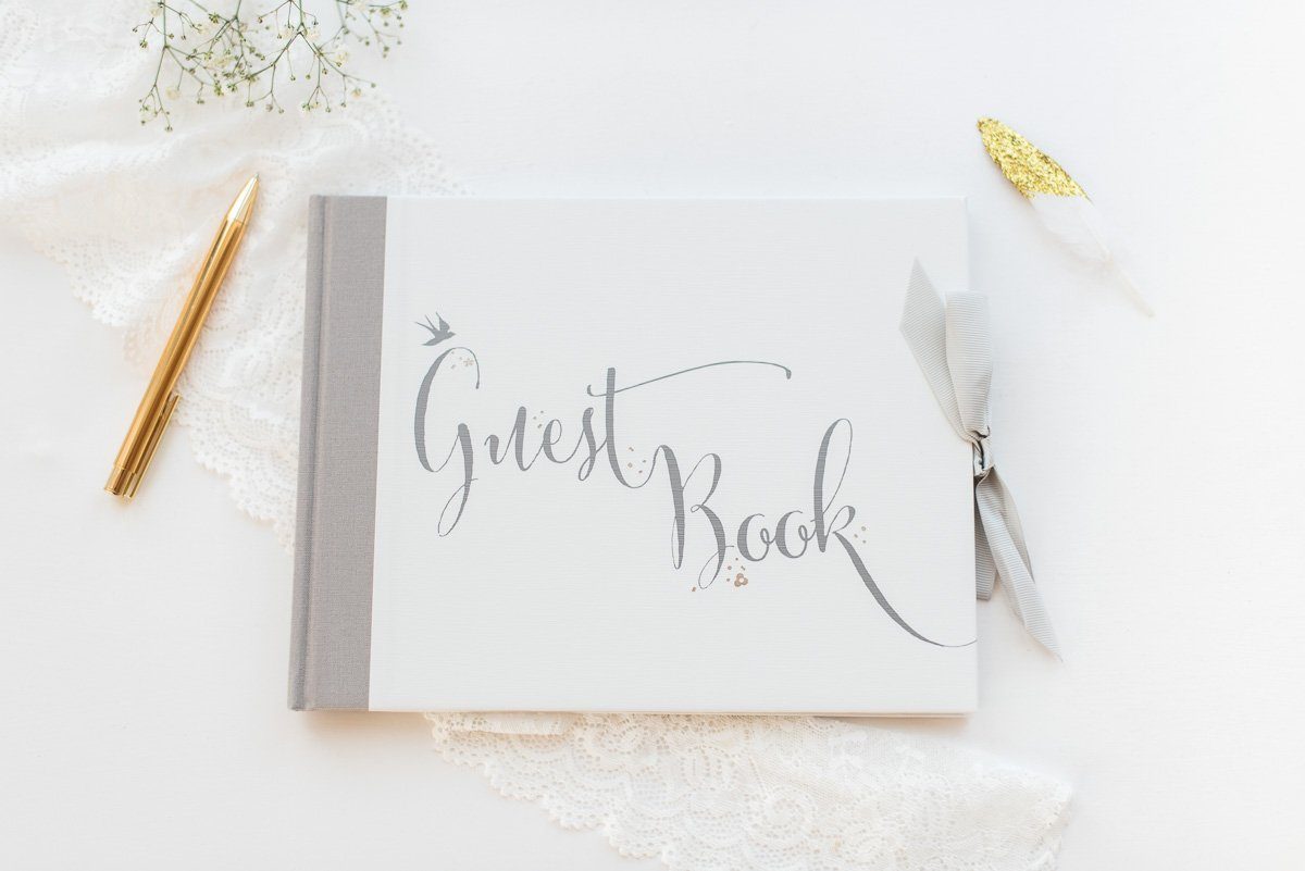 Oh, welch schöne Botschaften! In diesem wunderschönen Gästebuch können sich die Hochzeitsgäste mit all ihren herzlichen Glückwünsche an eurem großen Tag verewigen. Das Buch wird mit einem grauen Satinband verschlossen und trägt die Aufschrift ‘Guest Book’.