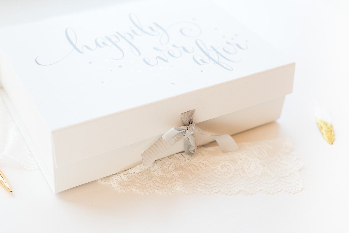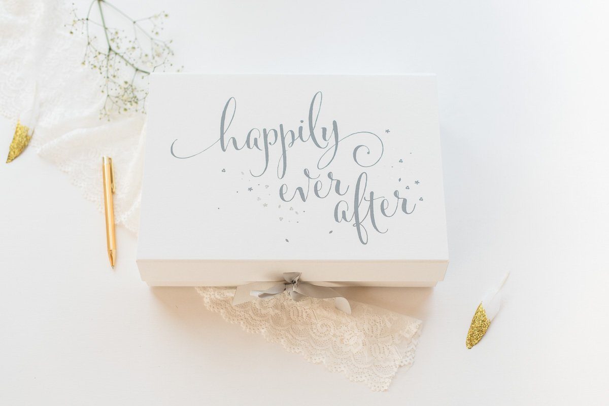 Und in einer hochwertigen Schachtel für besondere Erinnerungen an den großen Tag finden die schönsten Erinnerungsstücke einen besonderen Platz. Die Erinnerungsbox ist aus stabilem Karton gefertigt und wird mit einem Satinband verschlossen. So sind eure Schätze gut aufgehoben!