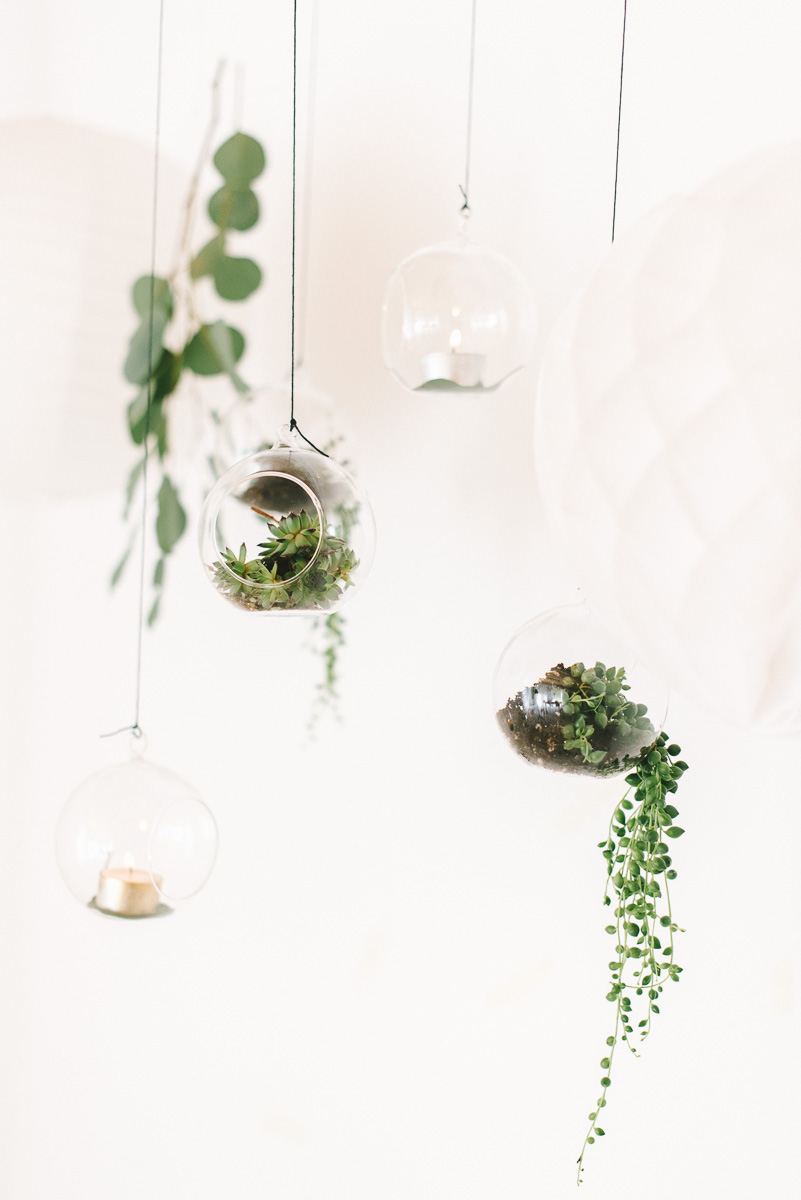 Hängt eine Gruppe der Glaskugeln über Euren Geschenketisch, der Candy Bar oder in die Fenster der Location. Ein paar Lampions dazu, hängende Zweige und schöne Satinbänder und fertig ist die Dekoration einer besonderen Stelle. Sie passen zu vielen Hochzeitsstilen! Mit einem Spitzenband und Blütenblättern werden sie Vintage, mit der schwarzen, gewachsten Schnur und kleinen Kakteen, urban modern.
