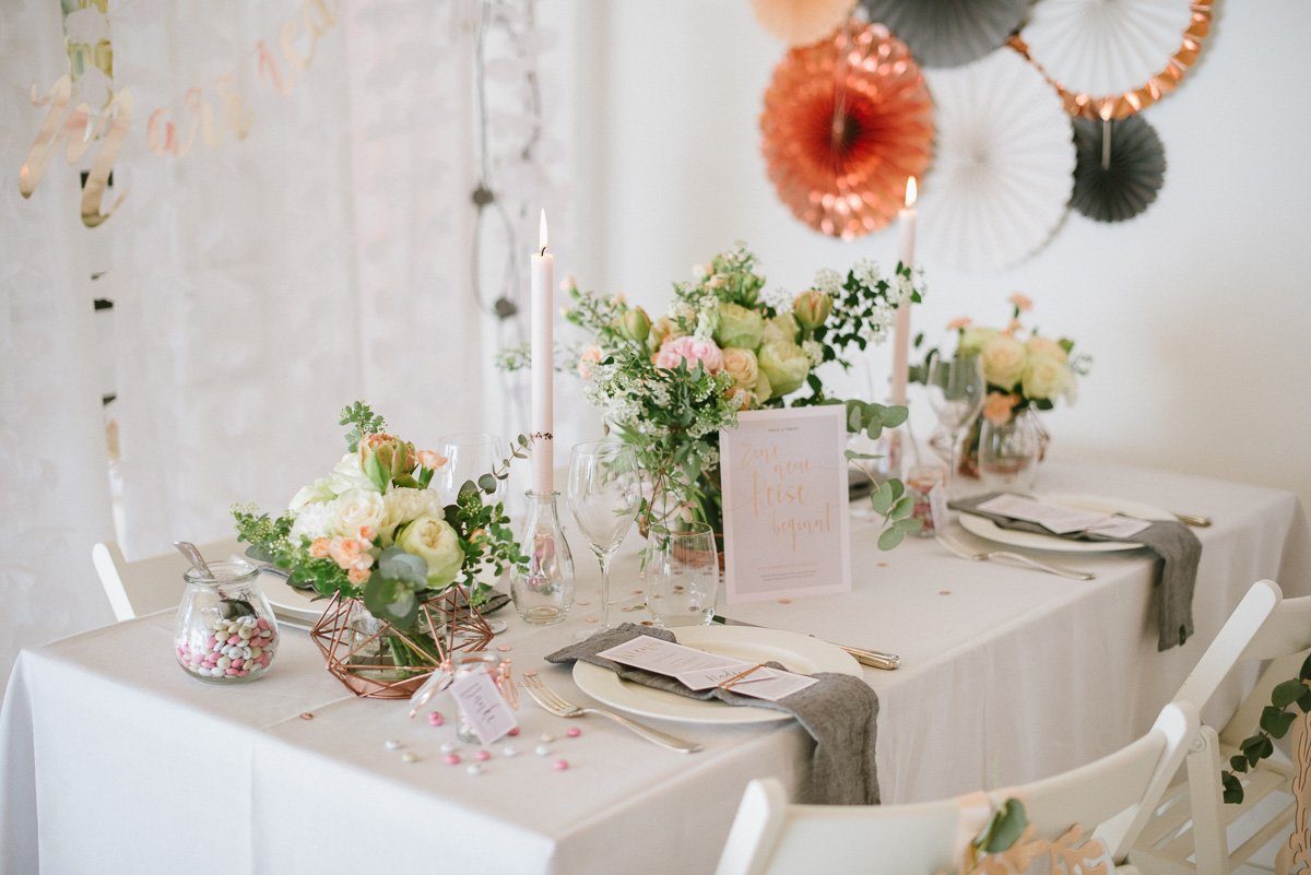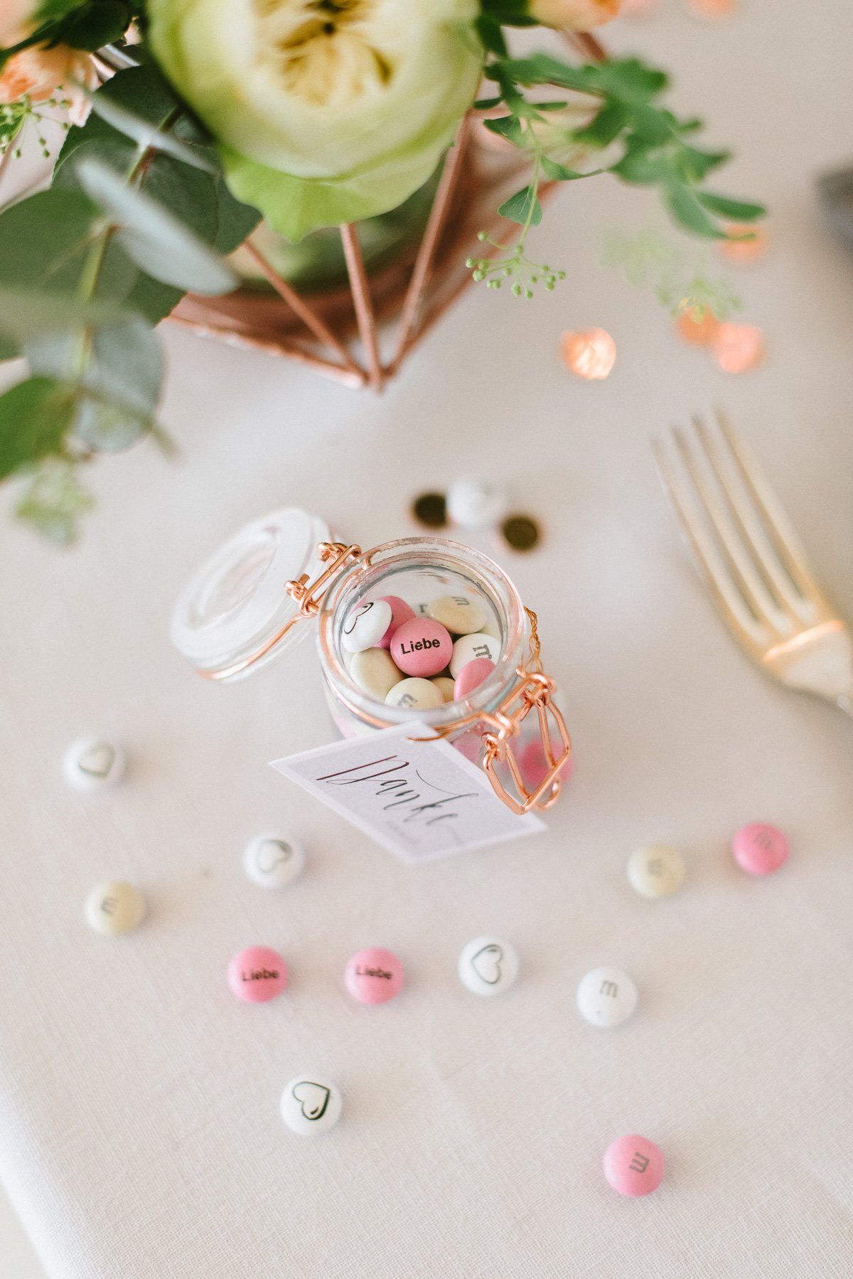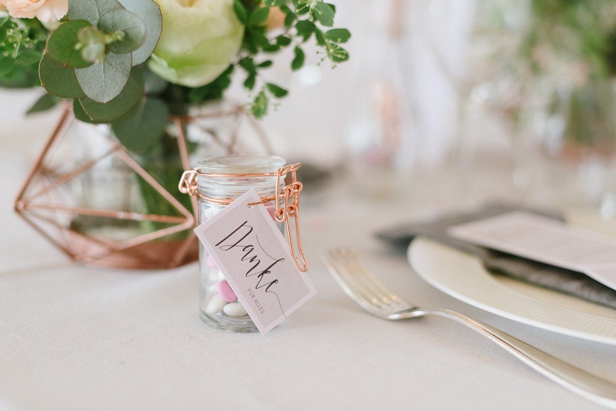 Wir haben uns für schlichte Botschaften entschieden und sie mit dem Wort ‘Liebe’ und einem Herz bedrucken lassen. Die Farbkombination weiß, creme und rosé fügt sich perfekt ins romantische Setup der Candybar und dem gedeckten Tisch ein.