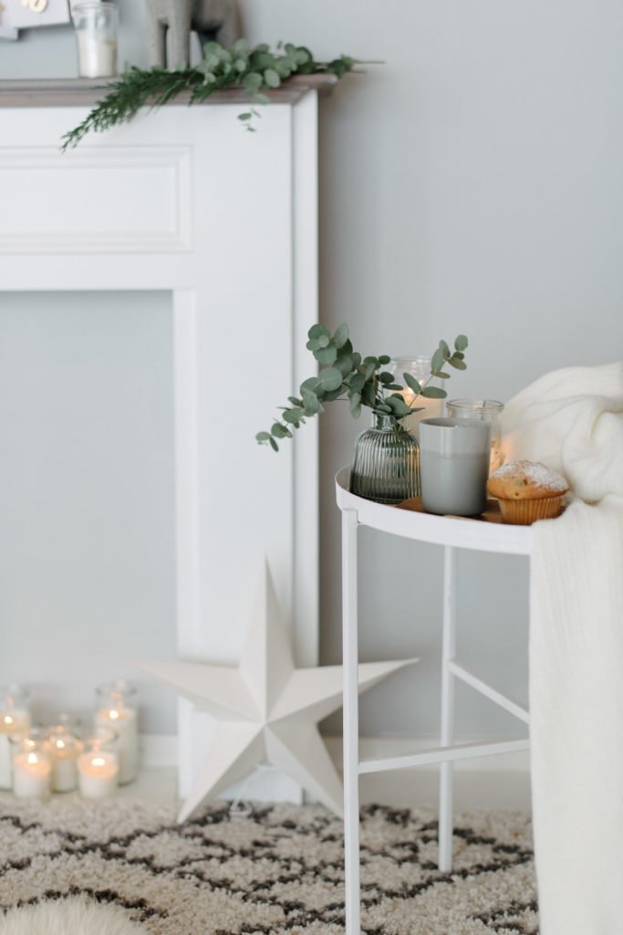 Ein paar grüne Zweige bringen Natürlichkeit und Tradition in die Adventsdekoration. Eukalyptus eignet sich auch hier sehr gut, er verliert keine Blätter. Thujazweige, Myrre oder auch Oliven halten ebenfalls mehrere Wochen und sehen auch getrocknet noch toll aus.