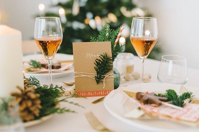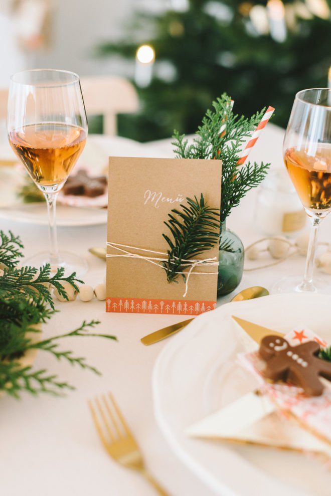 Den Stempel mit weißer Stempelfarbe auf die Kraftpapier Karte aufstempeln, den unteren Rand der Karte mit Klebeband bekleben und diese mehrmals mit Garn umwickeln. Ein Tannen- oder Rosmarinzweig hinein und fertig ist die Menükarten. Auf der Rückseite habt Ihr ausreichend Platz, um Eure Gänge aufzuschreiben.