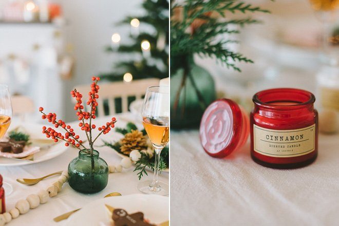Holz wirkt immer sehr gemütlich und heimelig. Eine lange Kette aus unterschiedlichen Holzperlen (Affiliate Link) ist schnell selbst aufgefädelt und schlängelt sich locker über den Tisch. Kleine grüne Vasen und rote Duftkerzen verteilen sich entlang des Tisches und greifen das Farbthema ebenfalls auf.