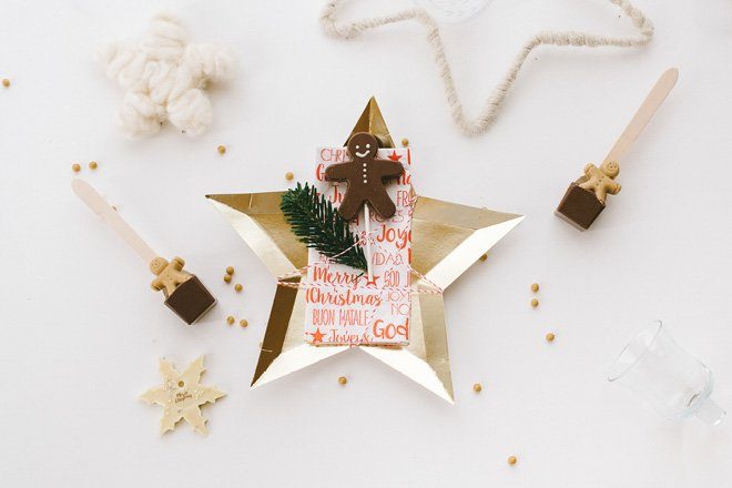 Die Servietten mit den roten Schriftzügen wurden einfach mit einem rot-weiß gestreiften Garn auf diese Teller gebunden. Ein grüner Tannenzweig noch dazu und einer der süßen Schokoladenmänner mit Knusperkugeln auf der Rückseite von Chocolate Valley. Diese kleinen Kerle sind eine wahre Sünde sag ich Euch! Eure Gäste werden sich über solch eine Begrüßung sicher freuen!